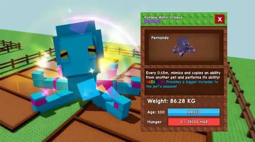 In trading circles, Rainbow Huge pets can sometimes sell for several times more than their non-rainbow counterparts. Owning a 60kg Rainbow Mimic Octopus with a 15-second cooldown places you firmly in the elite tier of collectors.