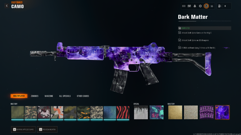 Home » Products » 💥[BO6 33 Dark Matter]💥 Level 55🎯+500 Total Camos🔥【33 Diamond+33 Gold+33 Dark Spine】🔥Handmade Bulletproof( No Tools )✅ Linkable to Bnet/Steam/PS✅