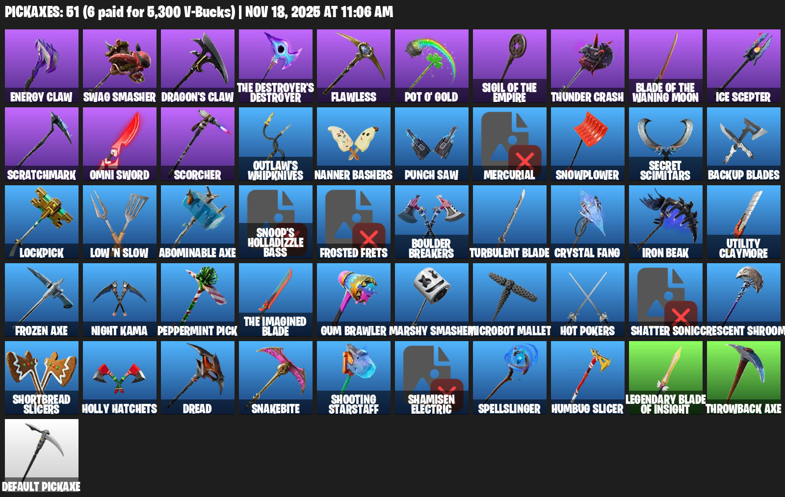 Energy Claw, Swag Smasher, Flawless, Pot O’ Gold, Thunder Crash, Ice Scepter, Scratchmark, Omni Sword, Scorcher, Outlaw’s Whipknives, Nanner Bashers, Punch Saw, Mercurial, Snowplower, Secret Scimitars, Backup Blades