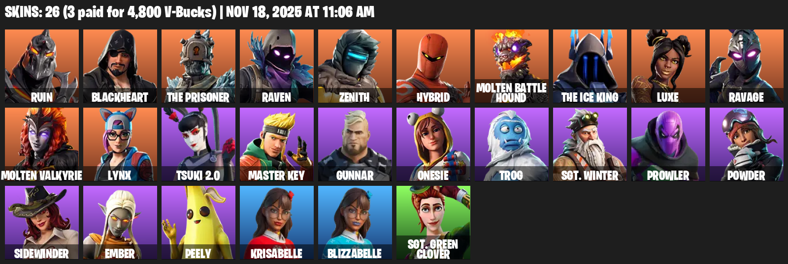 Ruin, Blackheart, The Prisoner, Raven, Zenith, Hybrid, Molten Battle Hound, Luxe, Ravage, Lynx, Tsuki 2.0, Master Key, Gunnar, Onesie, Trog, Sgt. Winter, Prowler, Powder