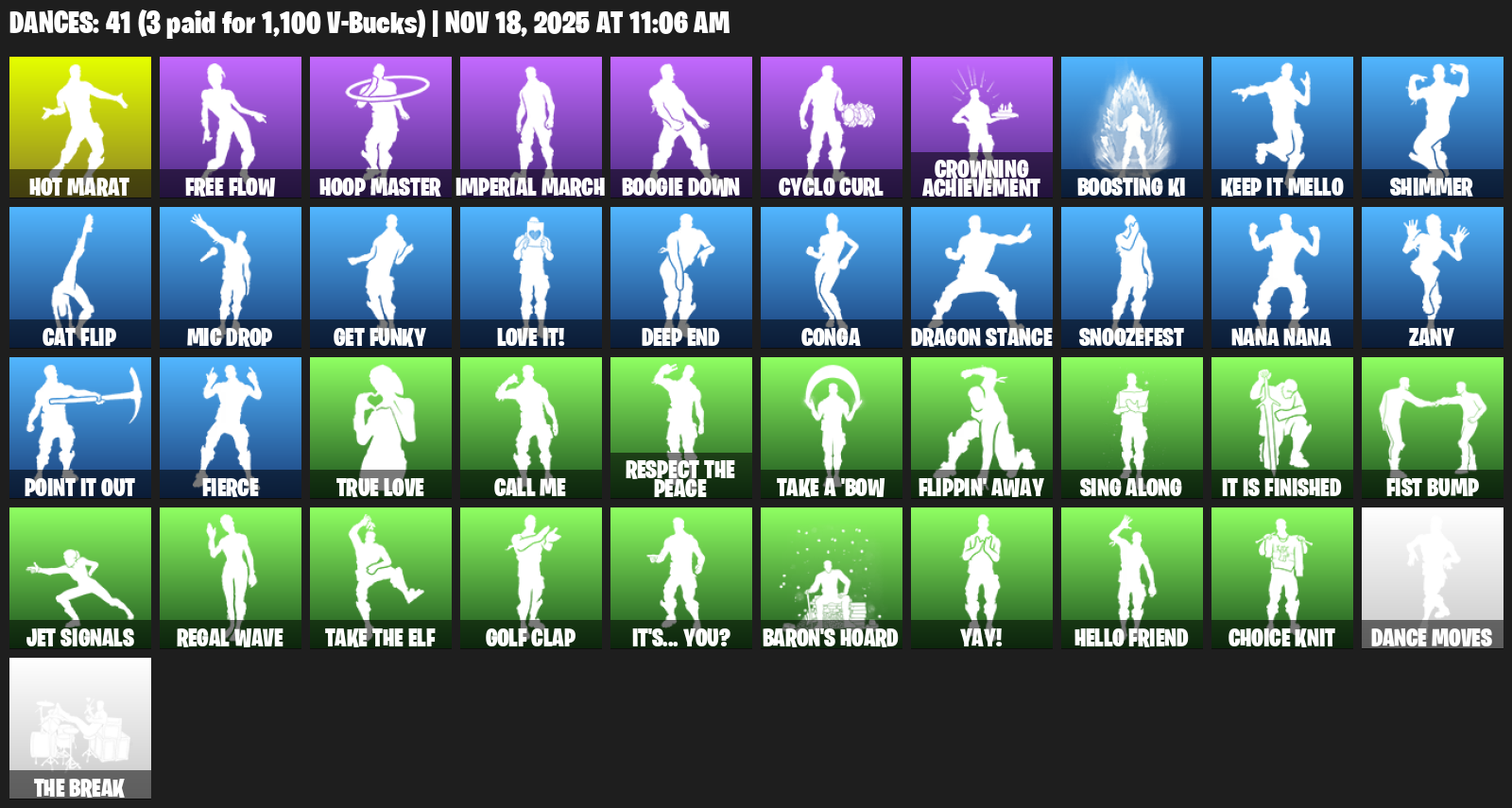 Hot Marat, Free Flow, Imperial March, Boogie Down, Cyclo Curl, Crowning Achievement, Boosting Ki, Keep It Mello, Shimmer, Cat Flip, Mic Drop, Get Funky, Love it!, Deep End, Conga, Dragon Stance, Snoozefest, Nana Nana, Zany