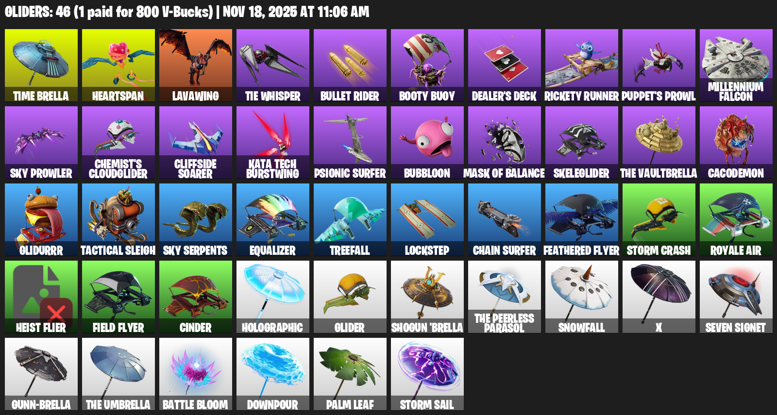 Time Brella, Heartspan, Lavawing, TIE Whisper, Bullet Rider, Booty Buoy, Dealer’s Deck, Rickety Runner, Puppet’s Prowl, Millennium Falcon, Chemist’s Cloudglider, Cliffside Soarer, Kata Tech Burstwing, Psionic Surfer, Bubbloon, Mask of Balance, Skeleglider, Cacodemon