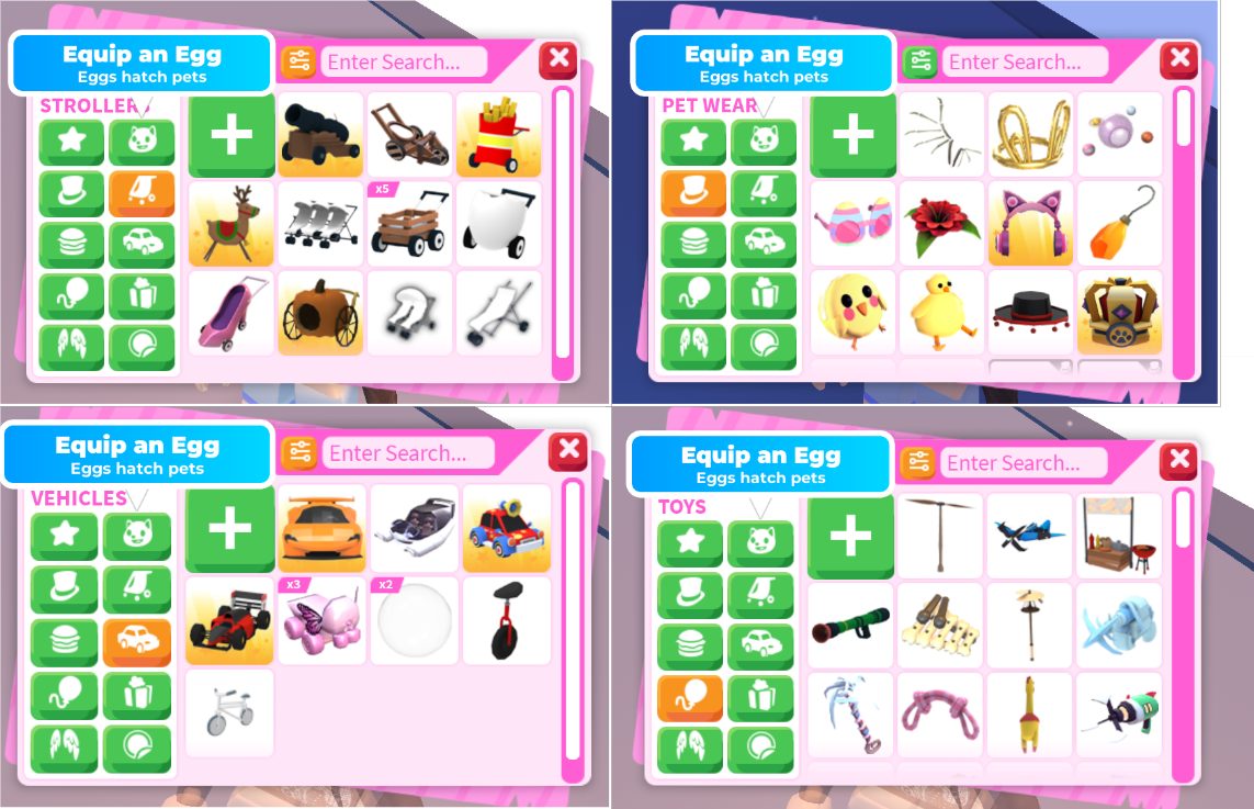 βοΈ Adopt Me: [ Golden Griffin FR + Frost Fury FR + Metal Ox + Aussie Egg + Fossil Egg + Ocean Egg + Snow Owl + Sloth … ] + [ Cannon Stroller + Catapult Stroller + French Fries + Reindeer Stroller + Triple Stroller … ] + [ Bone Wings + Bunny ear Tiara + Galaxy Explorer + Egg Glasses + Forgotten Flower + Pink Cat ear … ] + [ Douglas + Hovercar + Clown Car + Rocket Racer … ]