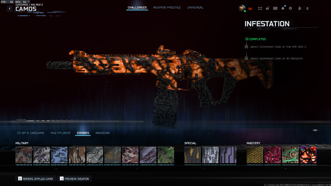 Home Β» Products Β» BO7 β¨ Prestige Master 56 β¨ Infestation 33/33 π Level 56 [P10] π All Guns Maxed π Bloodstone Camo unlocked π‘ Doomsteel π§ Full Access π Cross-platform ready
