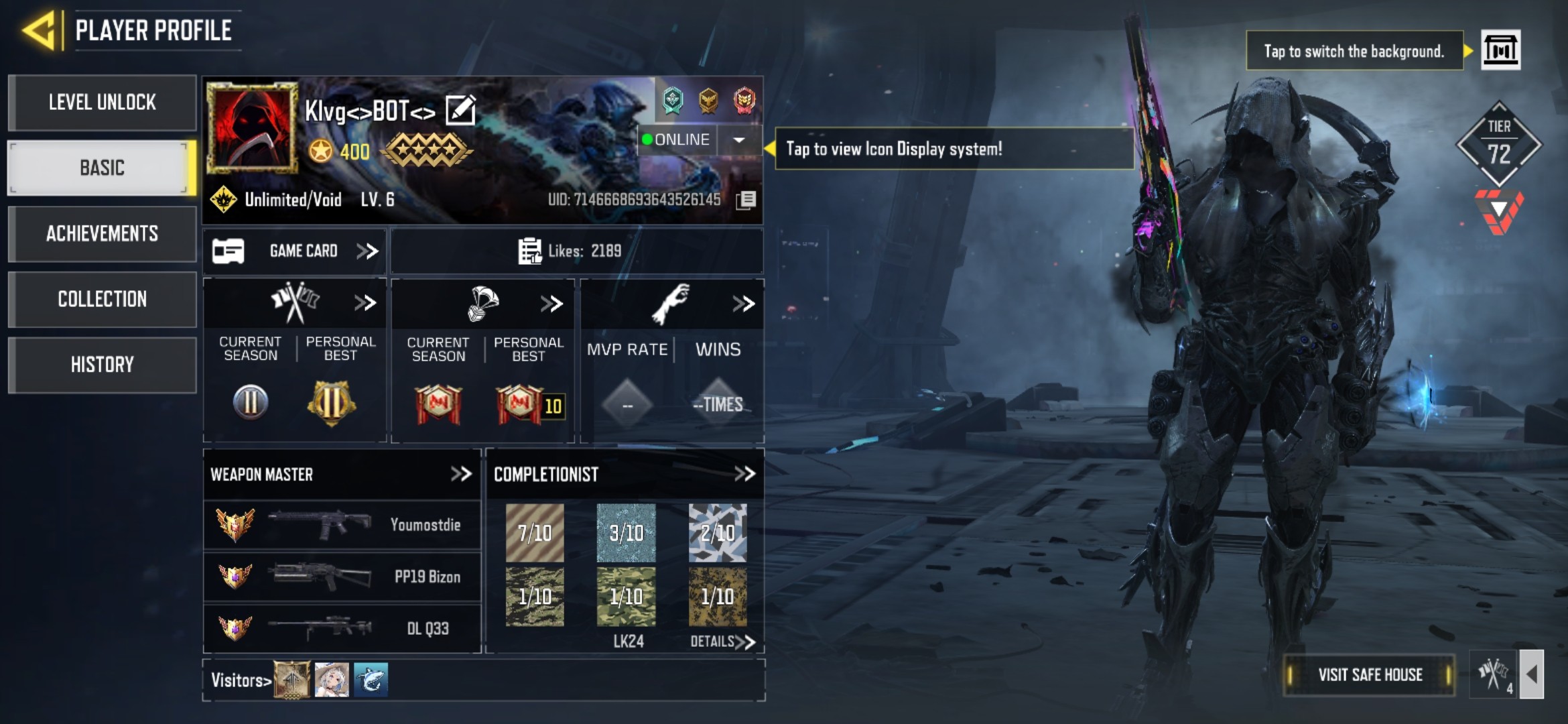 • UID : 7146668693643526145 (You can look this up in-game to see everything on the account.