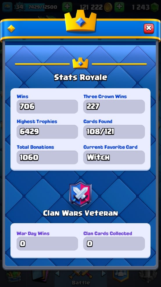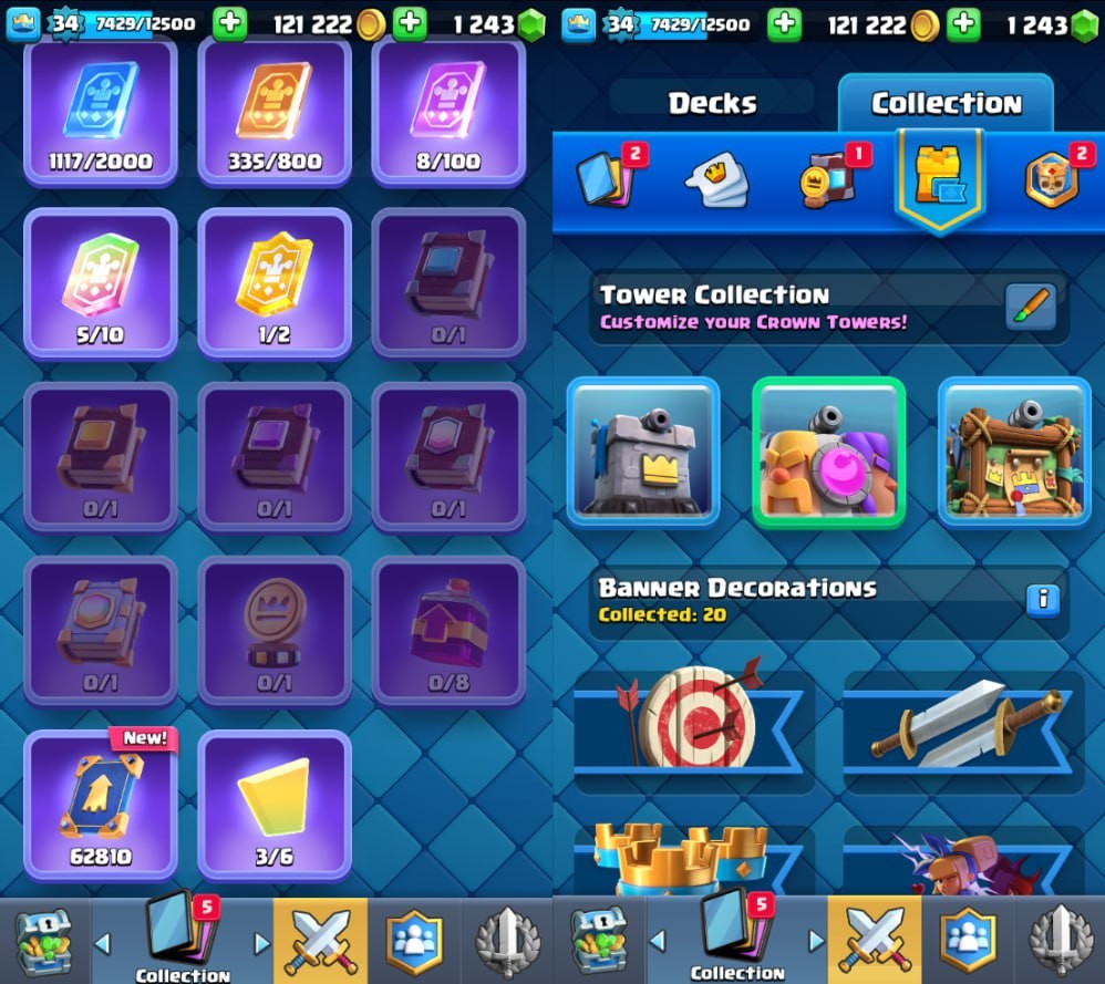 Clash Royale Account (IOS/Android) – Level 34 | Kings Tower 12 | 6336 Trophy | 108 Cards | 21 Emotes | 1243 Gems | 121 k Gold