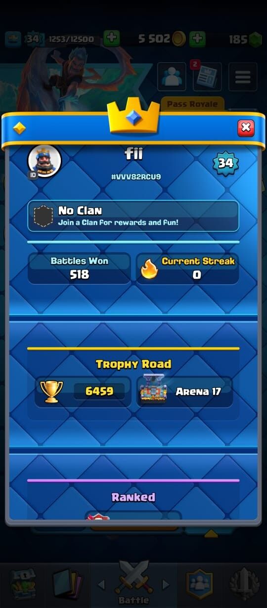 Home » Products » Clash Royale Account (IOS/ANDROID) – Level 34 | KT 12 | Gold 5502 | Gems 185 | Cards 113 | Emotes 12 | Trophies 6459 |