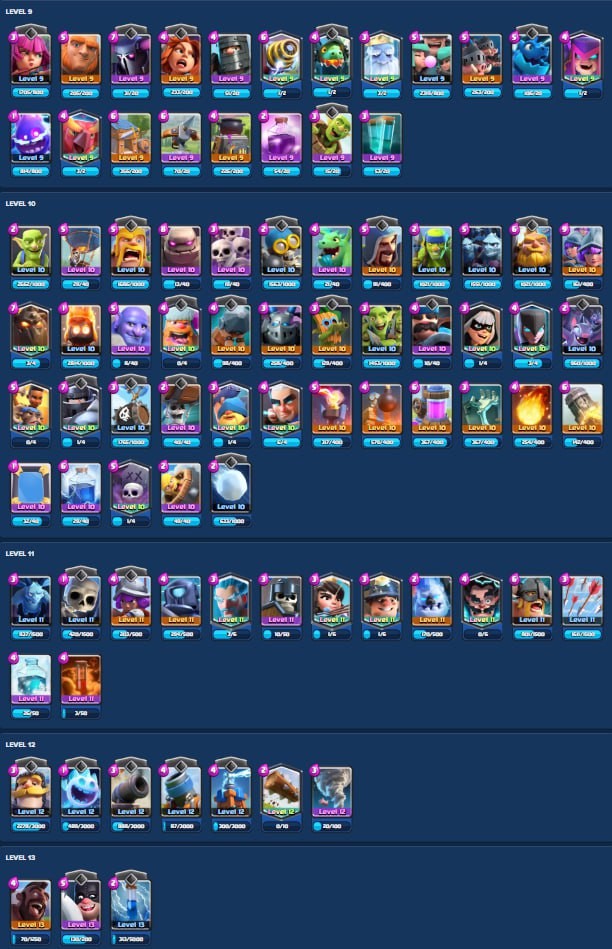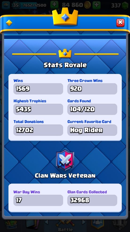 Clash Royale Account (IOS/Android) – Level 35 | Kings Tower 12 | 5402 Trophy | 104 Cards | 17 Emotes | 337 Gems | 84 k Gold