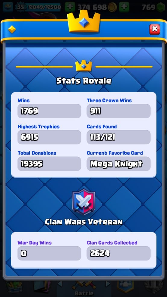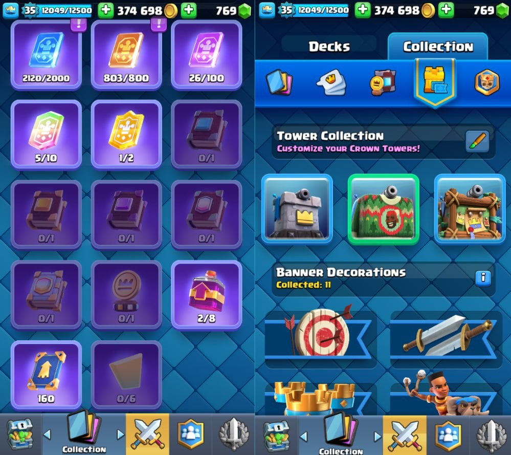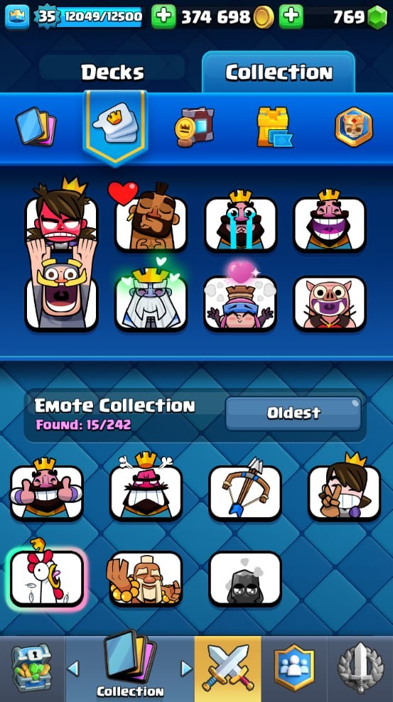 Clash Royale Account (IOS/Android) – Level 35 | Kings Tower 12 | 6831 Trophy | 113 Cards | 15 Emotes | 769 Gems | 374 k Gold