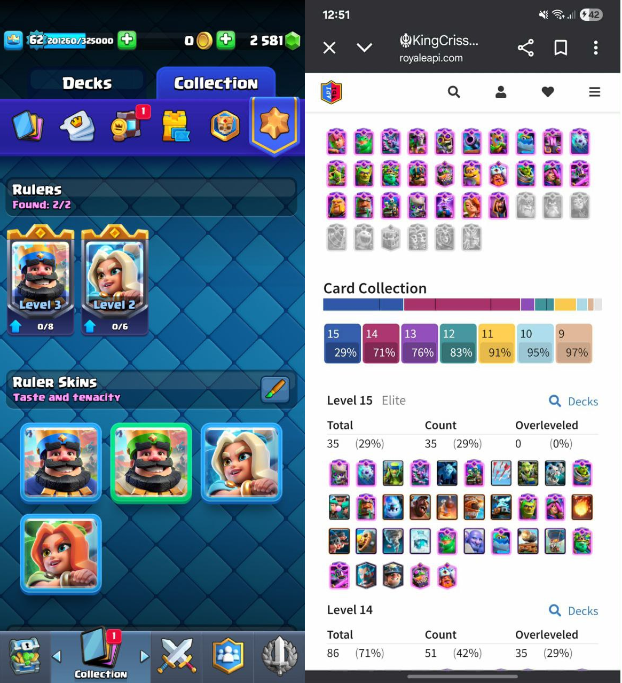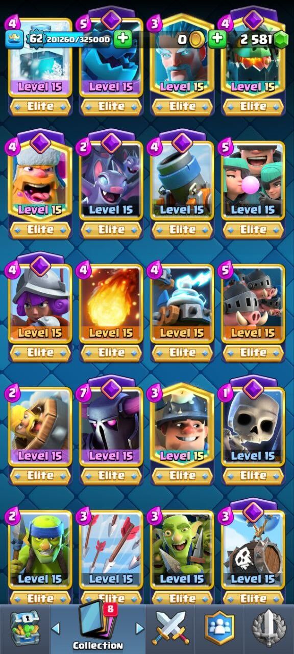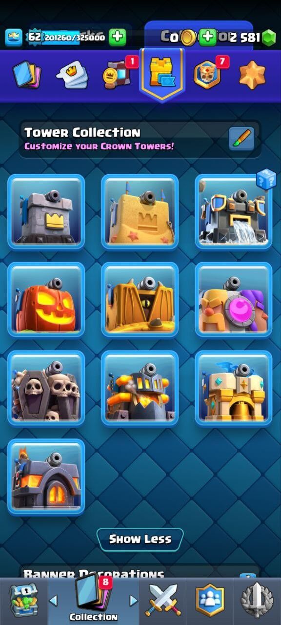 Kings Tower 15 °° LVL-62 °° 14K+ TROPHY °° 29 EVO CARD °° 35 ELITE CARD °° TOTAL 86 MAX CARD °° 106 EMOTE °° 118 BANNER COLLECTED °° 10 TOWER SKIN °° 2580+ GEMS