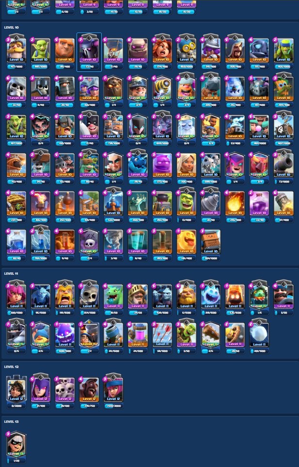 Clash Royale Account (IOS/Android) – Level 36 | Kings Tower 12 | 5000 Trophy | 105 Cards | 17 Emotes | 669 Gems | 671 k Gold