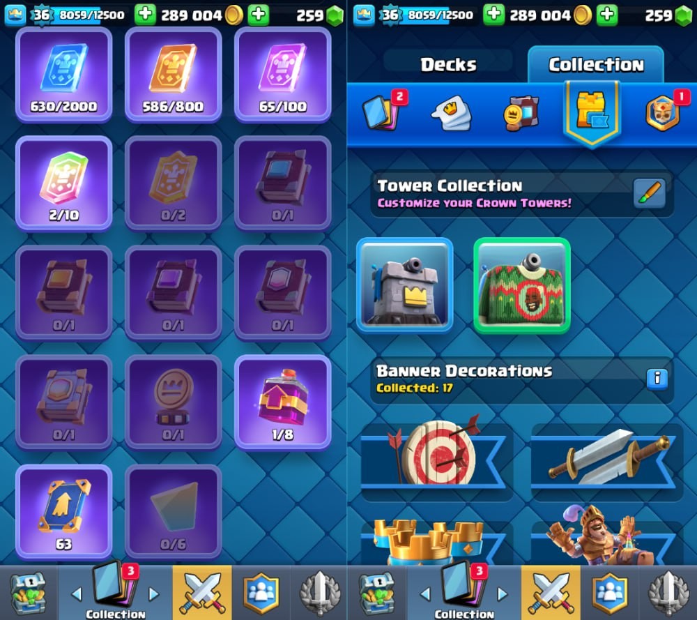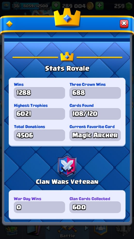 Clash Royale Account (IOS/Android) – Level 36 | Kings Tower 12 | 6021 Trophy | 108 Cards | 38 Emotes | 259 Gems | 289 k Gold