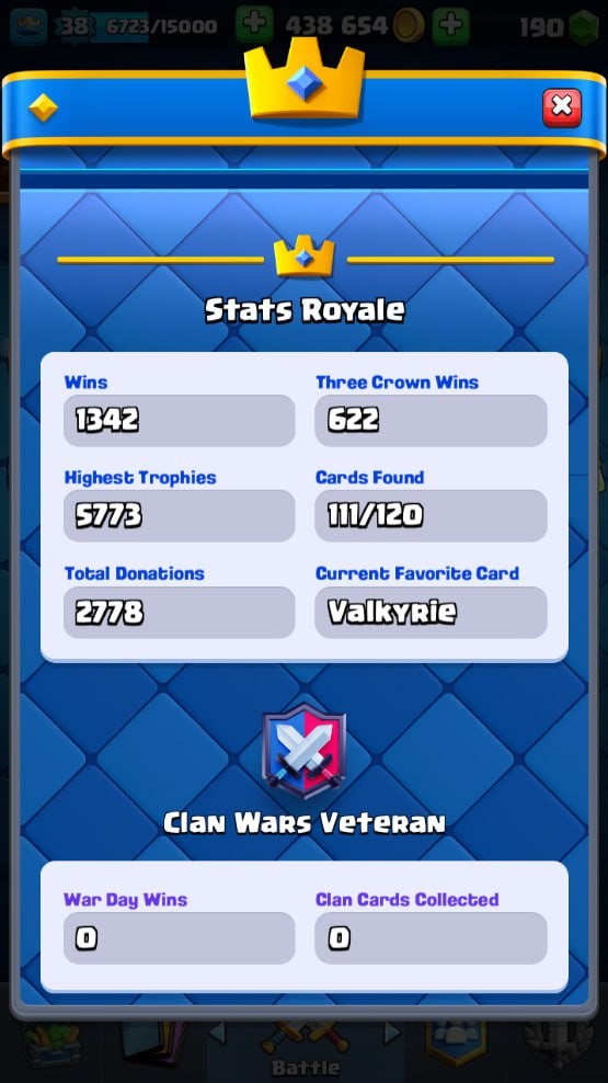 Clash Royale Account (IOS/Android) – Level 38 | Kings Tower 13 | 5716 Trophy | 111 Cards | 28 Emotes | 190 Gems | 438 k Gold