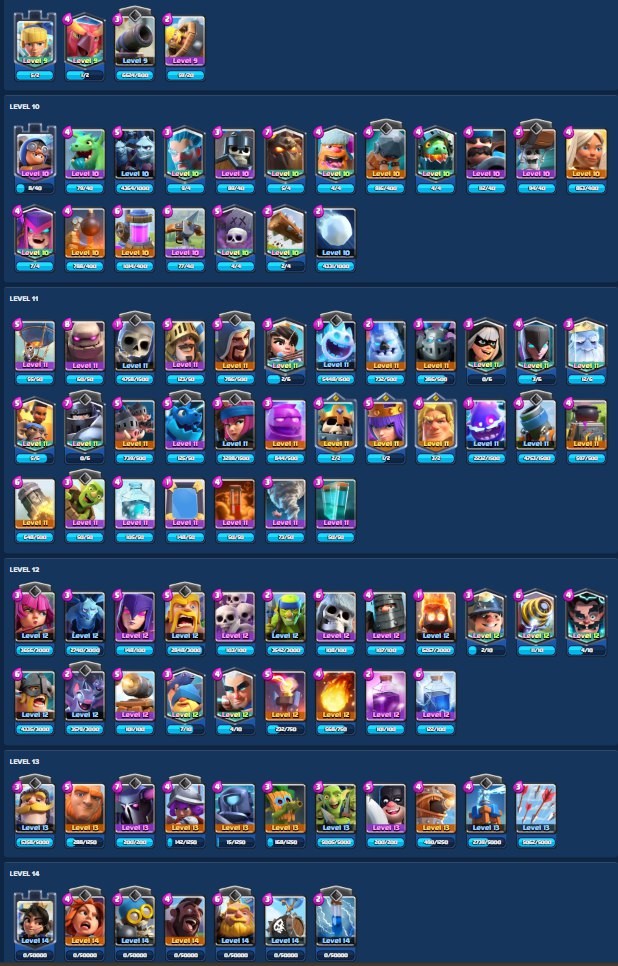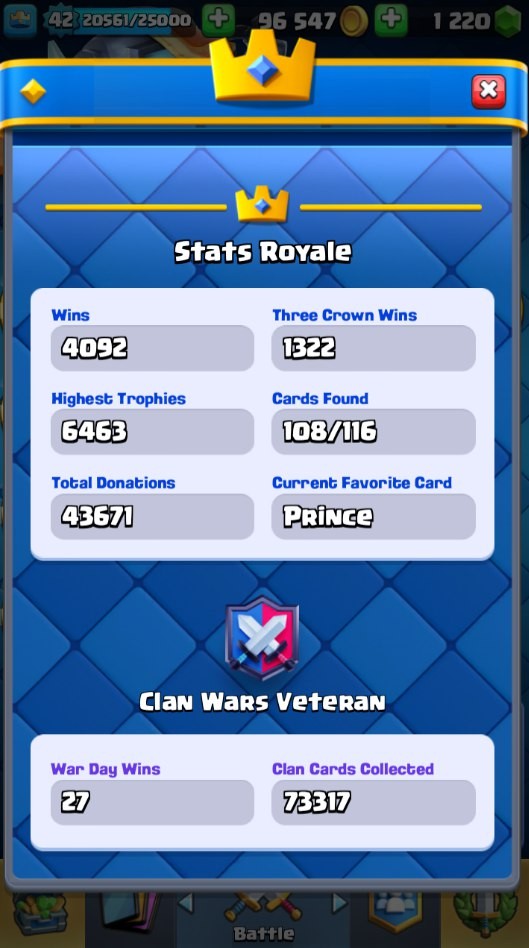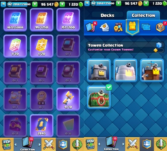 Clash Royale Account (IOS/ANDROID) – Level 42 | Kings Tower 14 | 6435 Trophies | 108 Cards | 36 Emotes | 1220 Gems | 96,000 Gold