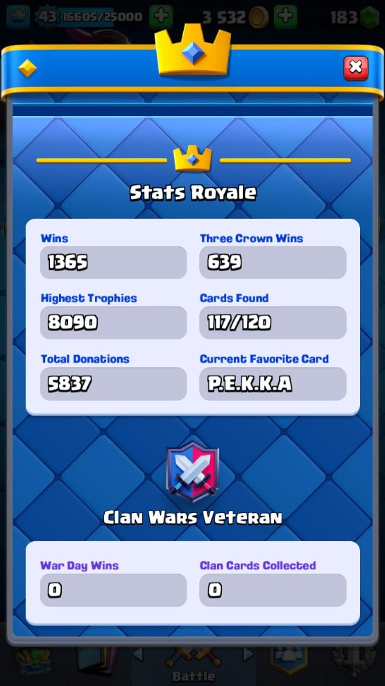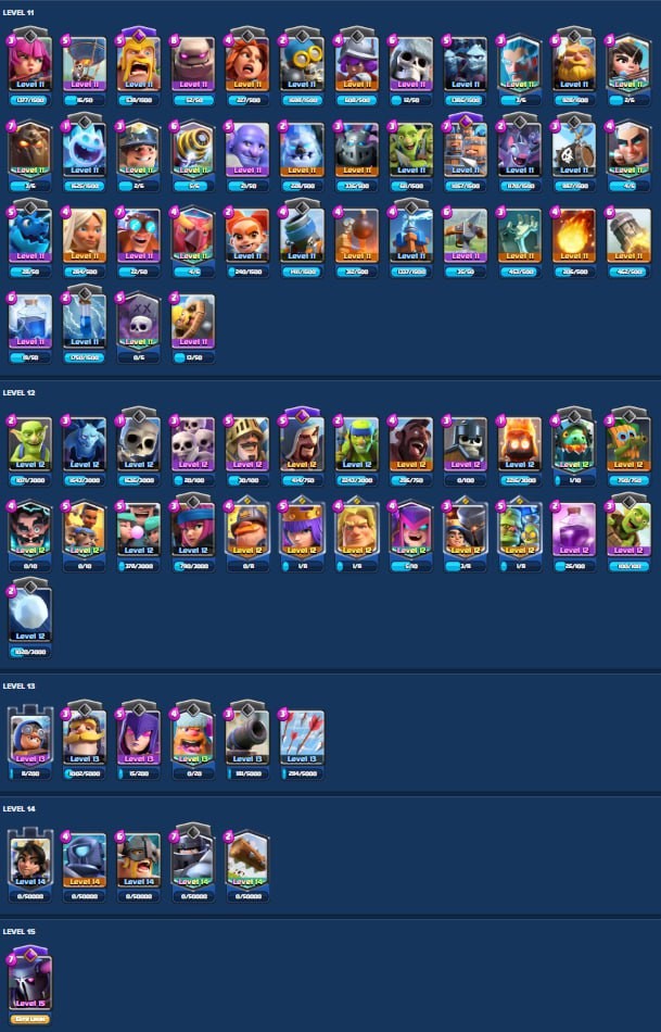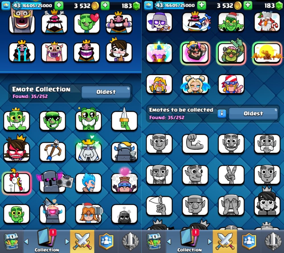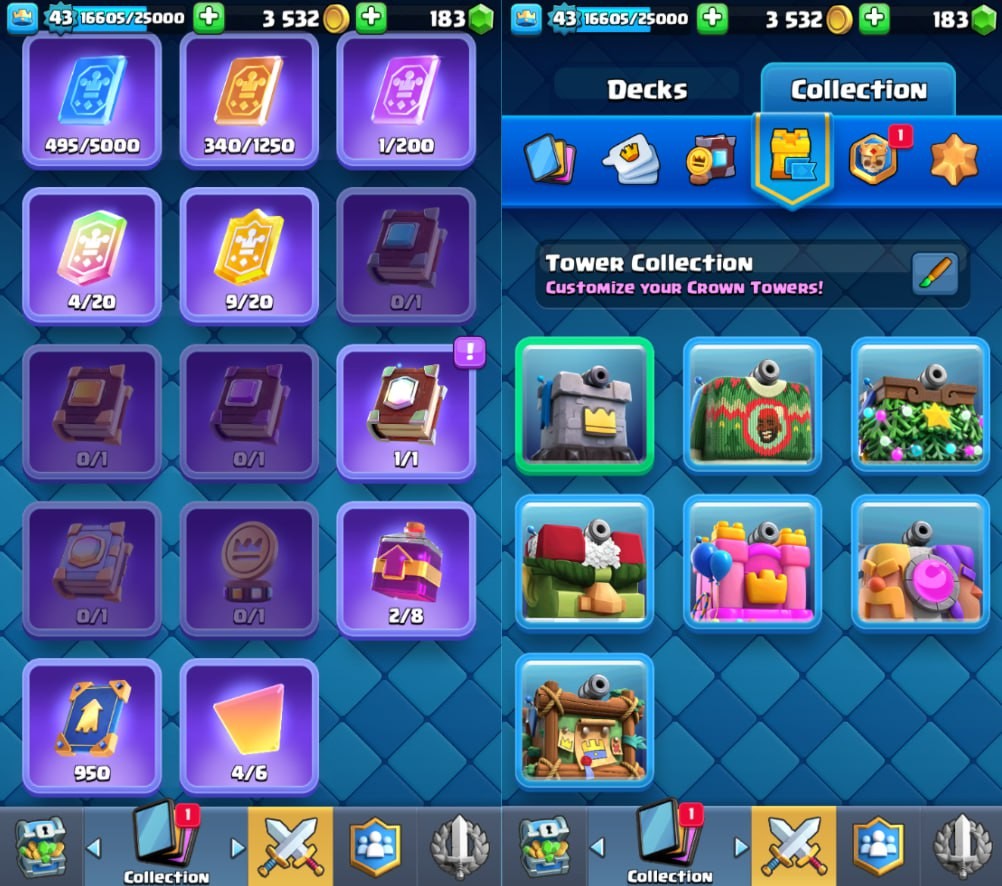 Clash Royale Account (IOS/ANDROID) – Level 43 | Kings Tower 14 | 8062 Trophies | 117 Cards | 35 Emotes | 183 Gems | 3,000 Gold