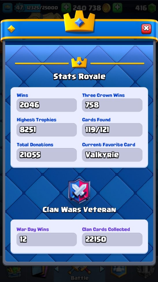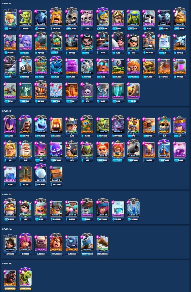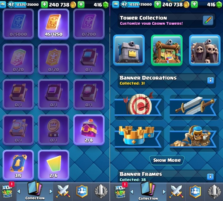 Clash Royale Account (IOS/ANDROID) – Level 47 | Kings Tower 14 | 8236 Trophies | 119 Cards | 31 Emotes | 416 Gems | 240,000 Gold