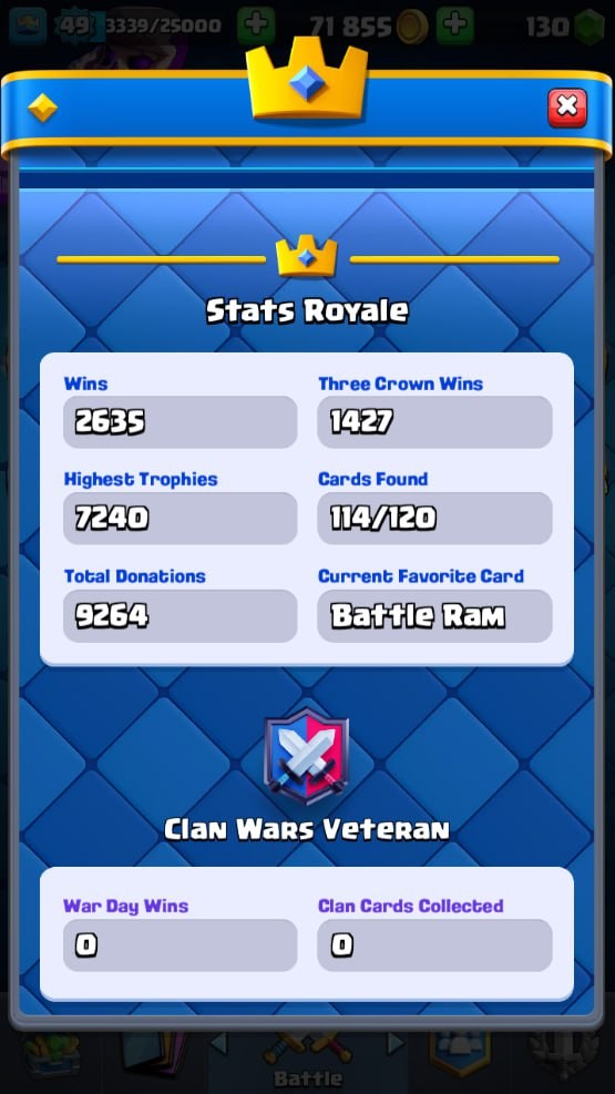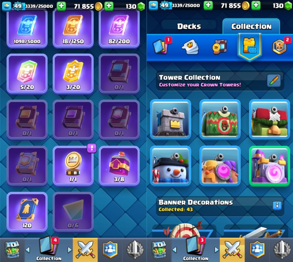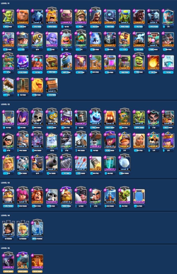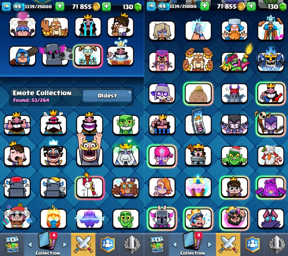 Clash Royale Account (IOS/ANDROID) – Level 49 | Kings Tower 14 | 7076 Trophies | 114 Cards | 53 Emotes | 130 Gems | 71,000 Gold