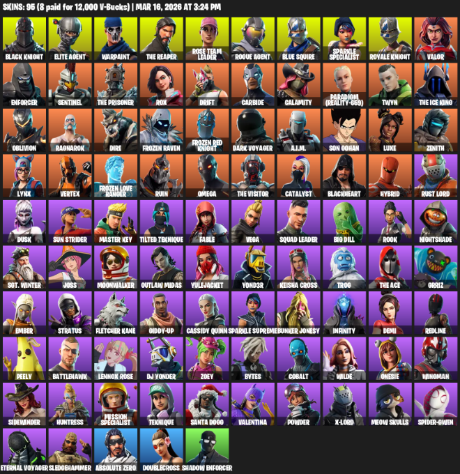 Home » Products » Fortnite Account ( PC ) (Black Knight, Elite Agent, The Reaper, Blue Squire, Sparkle Specialist, Omega, Warpaint, Rose Team Leader, Valor, Enforcer, Sentinel, Rox, Drift, Carbide, Calamity, Paradigm (Reality-659), Twyn) (95 Skins)