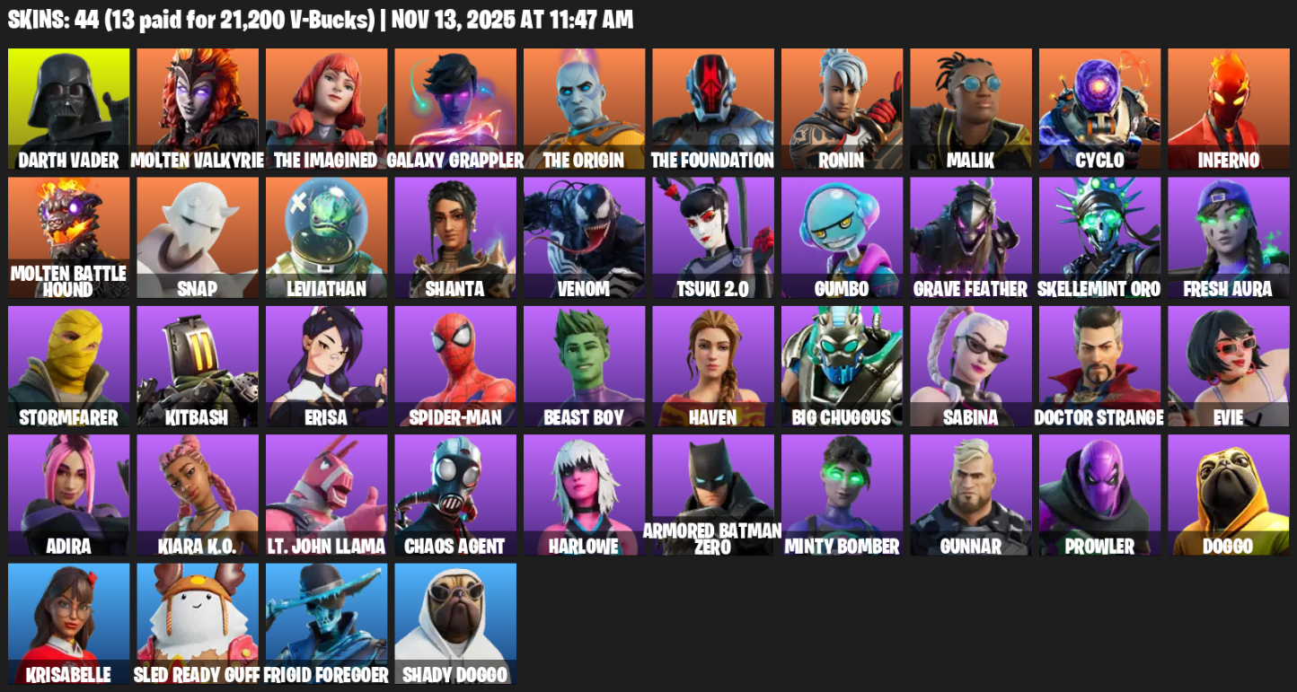 Home » Products » Fortnite Account ( PC ) (Darth Vader, Molten Valkyrie, The Imagined, Galaxy Grappler, Ronin, Malik, Cyclo, Inferno, Snap, Leviathan, Shanta, Venom, Tsuki 2.0, Gumbo, Grave Feather, Skellemint Oro, Fresh Aura) (44 Skins)