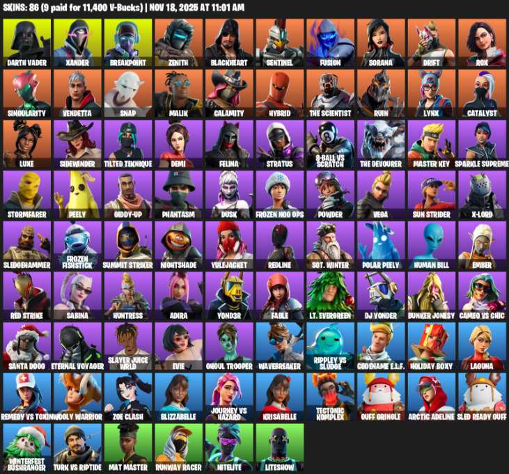 Home » Products » Fortnite Account ( PC ) (Darth Vader, Xander, Breakpoint, Zenith, Blackheart, Sentinel, Fusion, Sorana, Drift, Rox, Singularity, Vendetta, Snap, Malik, Calamity, Hybrid, The Scientist, Ruin, Lynx, Catalyst) (86 Skins)