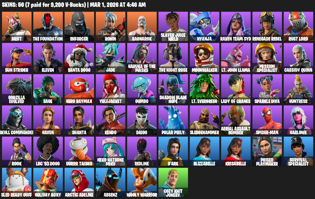 Home » Products » Fortnite Account ( PC ) (Drift, The Foundation, Enforcer, Ronin, Ragnarok, Slayer Juice WRLD, Nyanja, Raven Team Syd, Renegade Rebel, Rust Lord, Sun Strider, Eleven, Santa Dogg, Jade, Moonwalker, Lt. John Llama, Mission Specialist, Cassidy Quinn) (56 Skins)