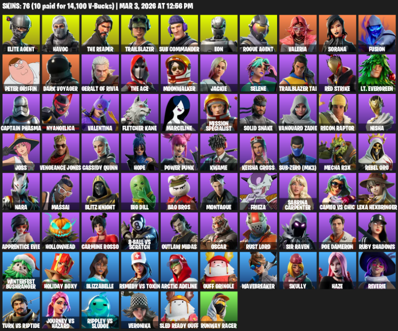 Fortnite Account ( PC ) (Elite Agent, The Reaper, Havoc, Trailblazer, Sub Commander, Eon, Valeria, Sorana, Fusion, Peter Griffin, Dark Voyager, Geralt of Rivia, Moonwalker, Jackie, Selene, Red Strike, Lt. Evergreen) (76 Skins) - MessyModdingStore