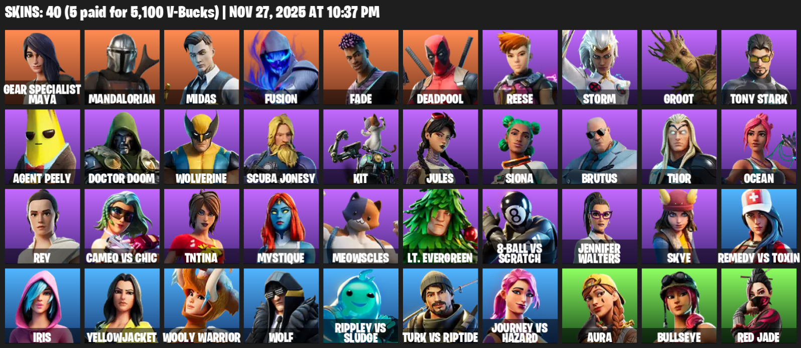 Home » Products » Fortnite Account ( PC ) (Gear Specialist Maya, Mandalorian, Midas, Fusion, Fade, Deadpool, Reese, Storm, Groot, Tony Stark, Agent Peely, Doctor Doom, Wolverine, Scuba Jonesy, Kit, Jules, Siona, Brutus, Thor, Ocean) (40 Skins)