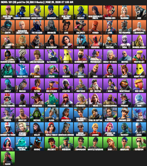 Home » Products » Fortnite Account ( PC ) (Gear Specialist Maya, Rose Team Leader, Carbon Commando, Rogue Agent, Warpaint, Trilogy, Tricera Ops, Glimmer, Dire, Zenith, Paradigm (Reality-659), The Ice King, Enforcer, Luxe, Calamity, Hybrid, Lynx, Ragnarok) (101 Skins)