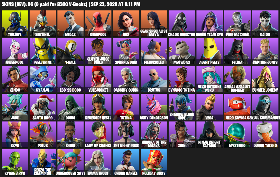 Home » Products » Fortnite Account ( PC ) (Gear Specialist Maya, Trilogy, Sentinel, Midas, Deadpool, Rox, Chaos Director, Raven Team Syd, War Machine, Daigo, Gwenpool, Peelverine, 1-Ball, Slayer Juice WRLD, Sparkle Diva, Meowscles, Meowdas, Agent Peely, Felina, Captain Jones) (56 Skins)