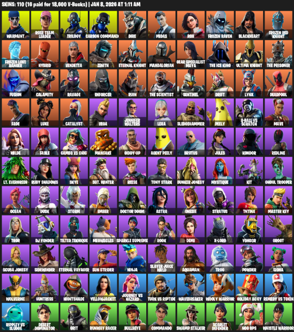 Fortnite Account ( PC ) (Gear Specialist Maya, Warpaint, Rose Team Leader, Trilogy, Carbon Commando, Dire, Midas, Rox, Frozen Raven, Blackheart, Hybrid, Vendetta, Zenith, Eternal Knight, Mandalorian, The Ice King) (110 Skins)