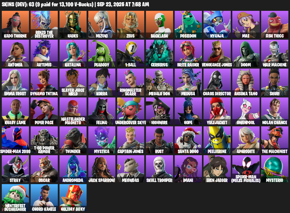 Home » Products » Fortnite Account ( PC ) (Kado Thorne, Renzo the Destroyer, Hades, Mizuki, Zeus, Backlash, Poseidon, Nyanja, Mae, Fish Thicc, Antonia, Artemis, Katalina, Peabody, 1-Ball, Cerberus, Brite Raider, Vengeance Jones, Doom, War Machine) (63 Skins)