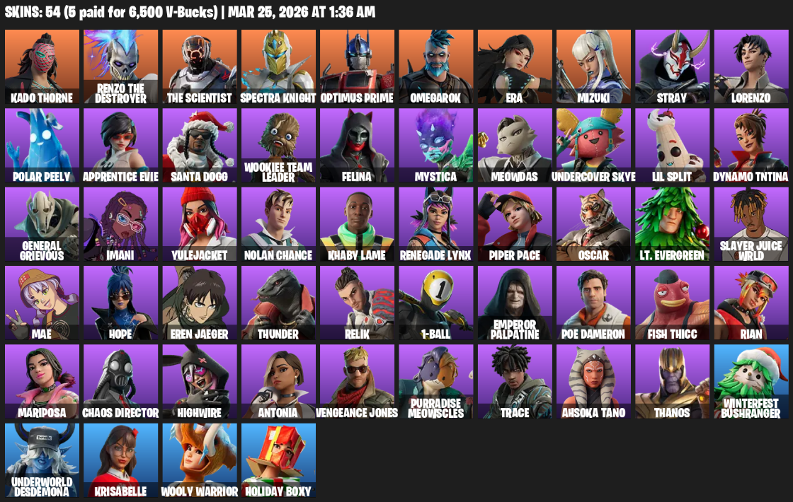 Home » Products » Fortnite Account ( PC ) (Kado Thorne, Renzo the Destroyer, Spectra Knight, Optimus Prime, Omegarok, Era, Mizuki, Stray, Lorenzo, Polar Peely, Apprentice Evie, Santa Dogg, Wookiee Team Leader, Felina, Mystica, Meowdas, Undercover Skye, Lil Split, Dynamo TNTina) (54 Skins)