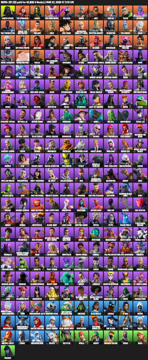 Home » Products » Fortnite Account ( PC ) (Lara Croft, Darth Vader, The Imagined, Hades, Galaxia, Ronin, Joey, Mizuki, Twyn, Kymera, Menace, Zeus, Son Goku, Paradigm (Reality-659), Spectra Knight, Predator) (231 Skins)
