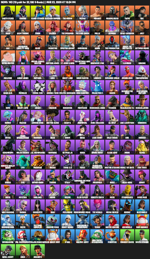 Home » Products » Fortnite Account ( PC ) (Lara Croft, Darth Vader, Xander, Cloud Striker, Blizzard Bomber, The Origin, Mizuki, Menace, Mandalorian, Twyn, Era, Snap, Kado Thorne, Torin, Valeria, Malik, Kymera, Spire Assassin) (163 Skins)