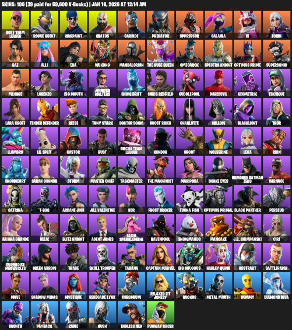 Home » Products » Fortnite Account ( PC ) (Lara Croft, Rose Team Leader, Rogue Agent, Warpaint, Kratos, Carbide, Predator, Oppressor, Galaxia, Vi, Torin, Raz, Alli, Era, Wukong, Mandalorian, The Cube Queen, Omegarok, Spectra Knight, Optimus Prime) (106 Skins)