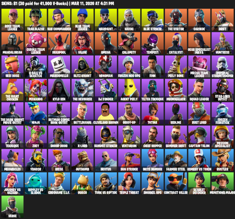 Home » Products » Fortnite Account ( PC ) (Omega, Gear Specialist Maya, Rose Team Leader, Trailblazer, Sub Commander, Warpaint, Havoc, Blue Striker, The Visitor, Carbide, Drift, Mandalorian, Deadpool, Valor, Calamity, Tempest, Catalyst, Huntress) (81 Skins)