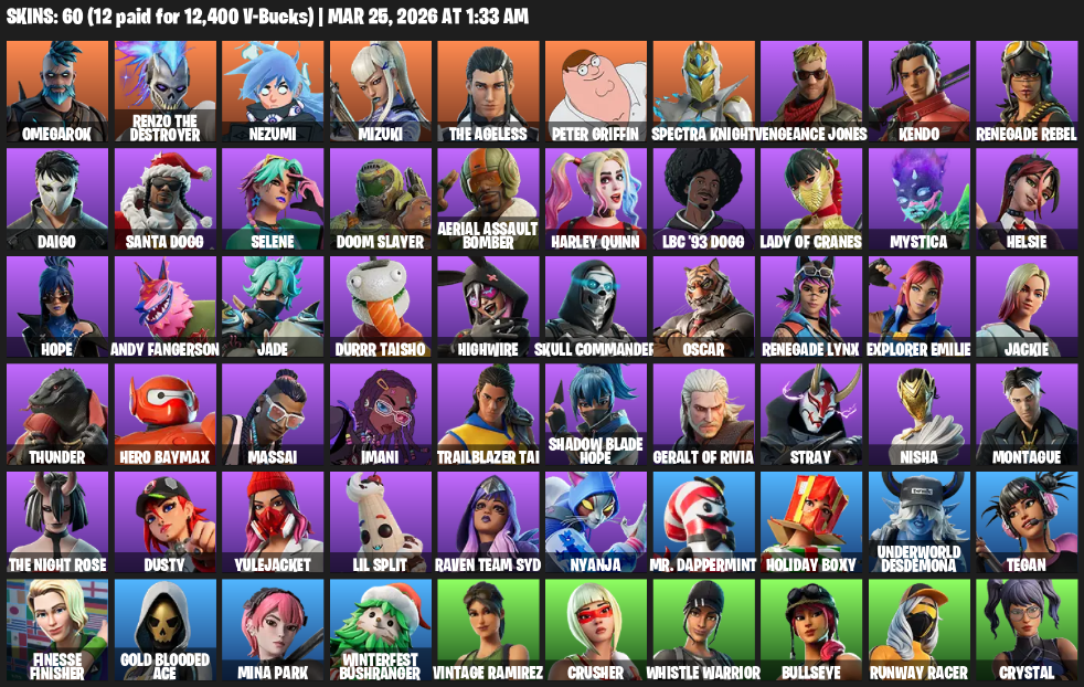 Fortnite Account ( PC ) (Omegarok, Renzo the Destroyer, Nezumi, Mizuki, Peter Griffin, Spectra Knight, Vengeance Jones, Kendo, Renegade Rebel, Daigo, Santa Dogg, Selene, Doom Slayer, Aerial Assault Bomber, Harley Quinn, Lady of Cranes, Mystica, Helsie) (60 Skins)