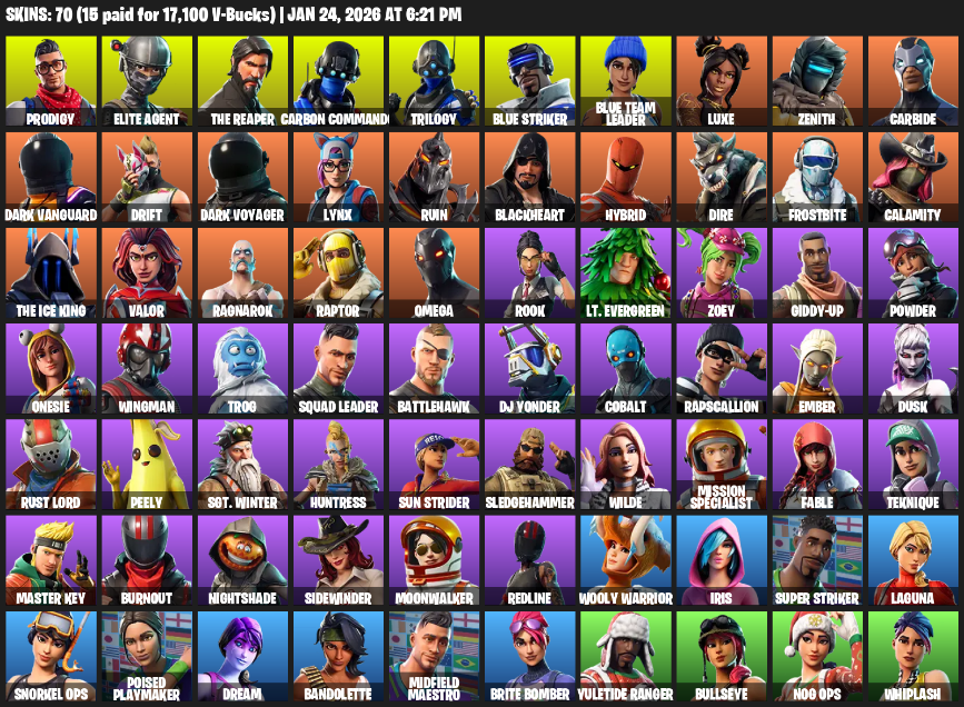 Home » Products » Fortnite Account ( PC / PLAYSTATION ) (Elite Agent, The Reaper, Omega, Prodigy, Carbon Commando, Trilogy, Blue Striker, Luxe, Zenith, Carbide, Dark Vanguard, Drift, Lynx, Ruin, Blackheart, Hybrid, Dire, Frostbite) (70 Skins)