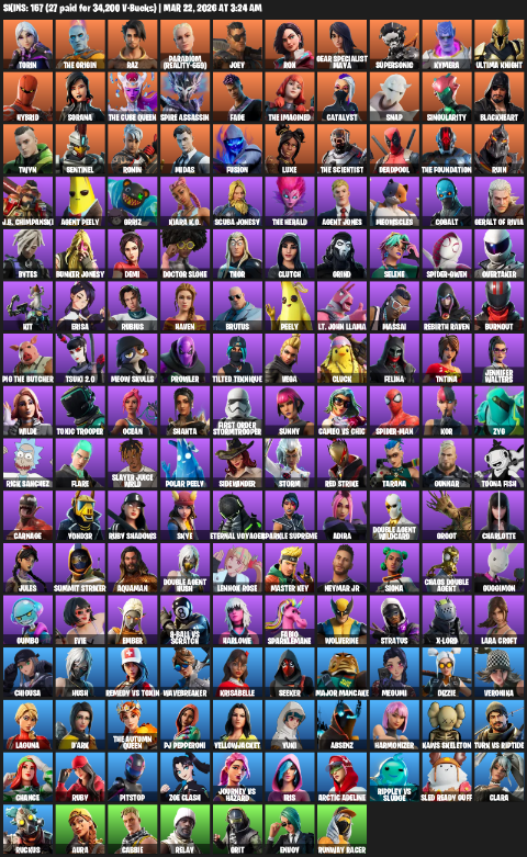 Fortnite Account ( PC / PLAYSTATION ) (Gear Specialist Maya, Lara Croft, Torin, The Origin, Raz, Paradigm (Reality-659), Joey, Rox, Supersonic, Kymera, Ultima Knight, Hybrid, Sorana, Spire Assassin, Fade, Catalyst, Snap, Singularity) (157 Skins) - MessyModdingStore