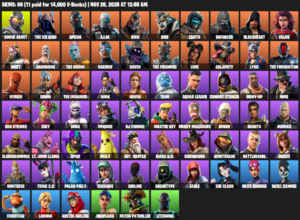 Home » Products » Fortnite Account ( PC / PLAYSTATION ) (Omega, Rogue Agent, The Ice King, A.I.M., Ruin, Dire, Zenith, Enforcer, Blackheart, Valor, Drift, Ragnarok, Carbide, Raven, Luxe, Calamity, Lynx) (66 Skins)