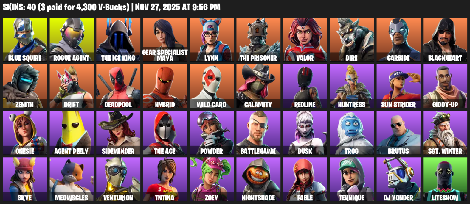 Home » Products » Fortnite Account ( PC / PLAYSTATION / XBOX ) (Blue Squire, Gear Specialist Maya, Rogue Agent, The Ice King, Lynx, Valor, Dire, Carbide, Blackheart, Zenith, Drift, Deadpool, Hybrid, Wild Card, Calamity, Redline, Huntress, Sun Strider, Giddy-up) (40 Skins)