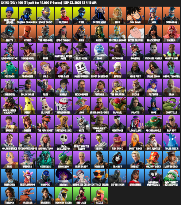 Home » Products » Fortnite Account ( PC / PLAYSTATION / XBOX ) (Blue Team Leader, Carbon Commando, Rogue Agent, Prodigy, Fixer, The Ice King, Zeus, Son Goku, Lynx, Omegarok, Zenith, Hybrid, Kado Thorne, Ruin, Hades, Spectra Knight, Peter Griffin, Blackheart, Valeria) (106 Skins)