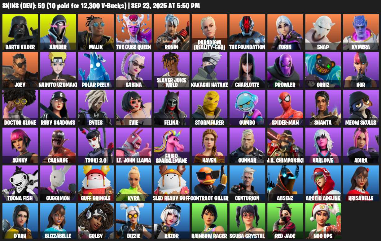 Home » Products » Fortnite Account ( PC / PLAYSTATION / XBOX ) (Darth Vader, Xander, Malik, The Cube Queen, Ronin, Paradigm (Reality-659), Torin, Snap, Kymera, Joey, Naruto Uzumaki, Polar Peely, Sabina, Slayer Juice WRLD, Kakashi Hatake, Charlotte, Prowler, Grriz, Kor) (59 Skins)
