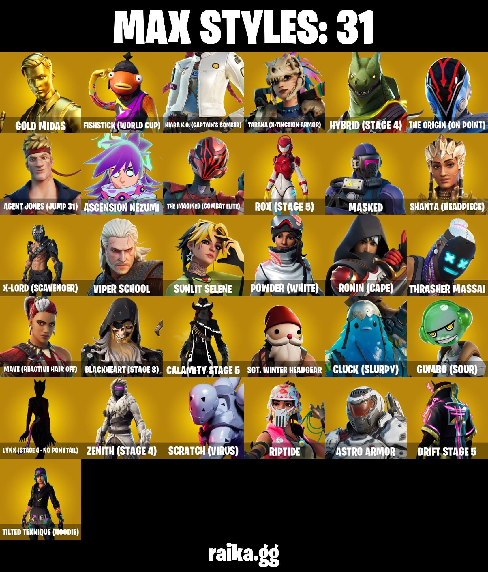 Home » Products » Fortnite Account ( PC / PLAYSTATION / XBOX ) (Gold Midas, Fishstick (World Cup), Major Lazer, Drift, Lynx, Carbide, Nezumi, Catalyst, The Origin, Calamity, Fusion) (105 Skins)