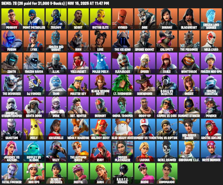 Home » Products » Fortnite Account ( PC ) (Point Patroller, Prodigy, Trilogy, Scout, Victor Elite, Hybrid, Dire, Sorana, Blackheart, Frozen Love Ranger, Fusion, Lynx, Ruin, Luxe, The Ice King, Spider Knight, Calamity, Wild Card) (78 Skins)