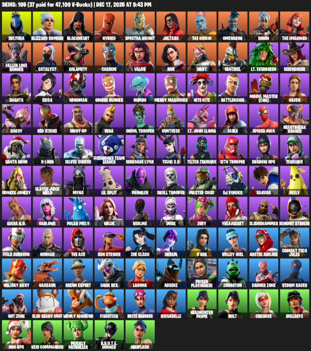 Fortnite Account ( PC ) (Sultura, Blizzard Bomber, Blackheart, Hybrid, Spectra Knight, Joltara, The Origin, Omegarok, Ronin, Fallen Love Ranger, Catalyst, Calamity, Carbide, Valor, Rox, Drift, Sentinel, Lt. Evergreen, Sidewinder) (105 Skins) - MessyModdingStore
