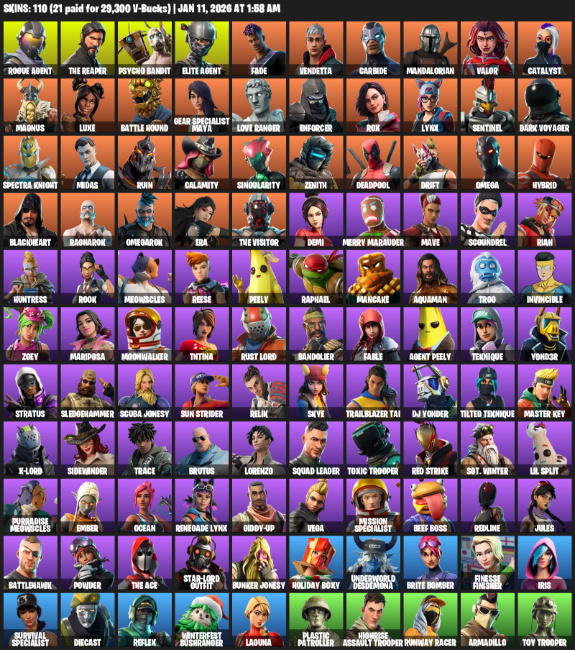 Fortnite Account ( PC ) (The Reaper, Elite Agent, Gear Specialist Maya, Omega, Psycho Bandit, Fade, Vendetta, Carbide, Mandalorian, Valor, Catalyst, Magnus, Luxe, Battle Hound, Love Ranger, Enforcer, Rox, Lynx, Sentinel) (110 Skins)