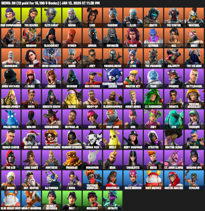 Home » Products » Fortnite Account ( PC ) (The Reaper, Elite Agent, Omega, Lara Croft, Sub Commander, Havoc, Luxe, Carbide, A.I.M., Zenith, Sentinel, Ruin, Wukong, Blackheart, Hybrid, Enforcer, Valor, Kymera, Raz) (96 Skins)