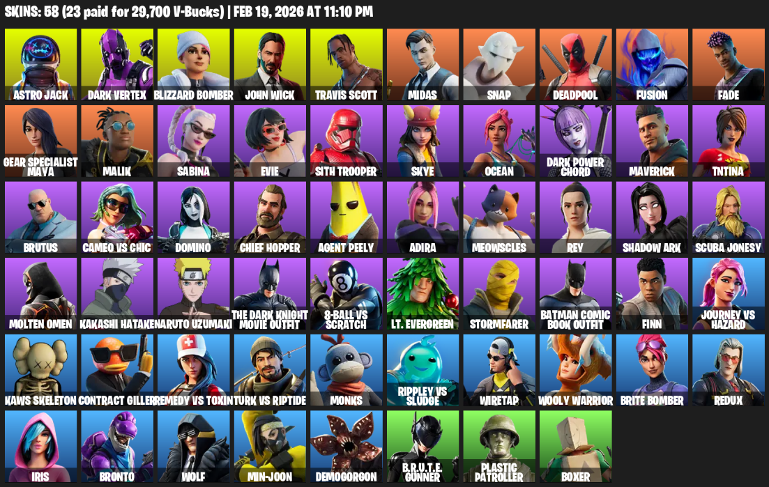Home » Products » Fortnite Account ( PC ) (Travis Scott, Gear Specialist Maya, Astro Jack, Dark Vertex, Blizzard Bomber, John Wick, Midas, Snap, Deadpool, Fusion, Fade, Malik, Sabina, Evie, Sith Trooper, Skye, Ocean, Maverick, TNTina) (58 Skins)
