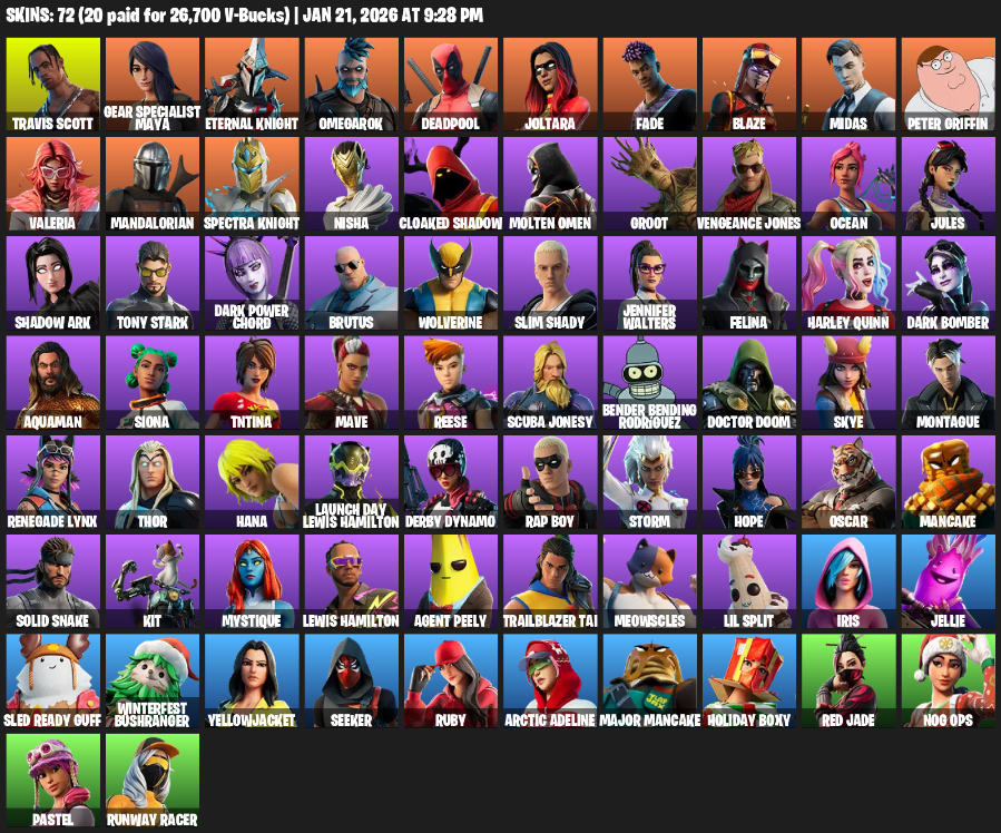 Fortnite Account ( PC ) (Travis Scott, Gear Specialist Maya, Eternal Knight, Omegarok, Deadpool, Joltara, Fade, Blaze, Midas, Peter Griffin, Valeria, Mandalorian, Nisha, Cloaked Shadow, Molten Omen, Groot, Vengeance Jones, Ocean, Jules) (72 Skins)